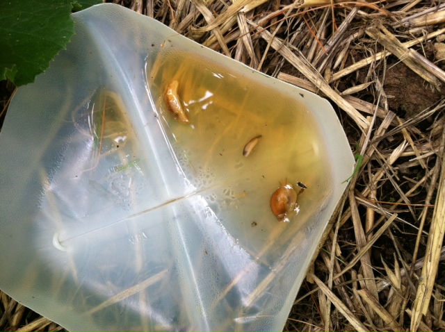 One creative idea I found, and that has worked well, was to make “beer traps”. The slugs love the sweetness of the beer and are drawn into the inverted water bottles to take a sip……….never to return to the garden again. I also placed some beer in the bottom of milk containers I had. This process, along with checking the vines every morning seems to be working for now.
